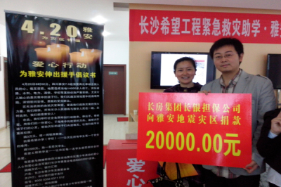 在地震發(fā)生的第一時(shí)間,長(zhǎng)沙市青年職工工作委員會(huì)就提出倡議,號(hào)召全市各級(jí)青年文明號(hào)集體踴躍為災(zāi)區(qū)群眾捐款,奉獻(xiàn)愛心。作為省、市青年文明號(hào)的長(zhǎng)銀擔(dān)保公司積極響應(yīng)市青工委的號(hào)召,4月23日下午,在長(zhǎng)銀擔(dān)保公司總經(jīng)理劉波的帶領(lǐng)下,全體公司員工進(jìn)行了抗震救災(zāi)捐款活動(dòng)。湘西分公司和郴州分公司的員工雖未能趕到捐款現(xiàn)場(chǎng),但紛紛委托長(zhǎng)沙同事代為獻(xiàn)上愛心,不讓愛心缺席。參與此次捐款活動(dòng)的共77人,募集捐款2萬元,愛心款已送至長(zhǎng)沙市青少年發(fā)展基金會(huì),由長(zhǎng)沙市青少年發(fā)展基金會(huì)將捐款轉(zhuǎn)交雅安災(zāi)區(qū)受難青少年群體。