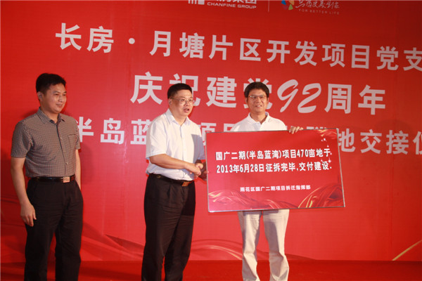 6月29日, “讓黨旗在工地上飄揚(yáng) 讓黨徽在崗位上發(fā)光 ”長(zhǎng)房•月塘片區(qū)開發(fā)項(xiàng)目黨支部慶祝建黨92周年暨半島藍(lán)灣項(xiàng)目征收騰地交接儀式在國(guó)廣公司售樓部隆重舉行。雨花區(qū)委書記周杏武,區(qū)委副書記汪娟等相關(guān)領(lǐng)導(dǎo), 集團(tuán)董事長(zhǎng)全臻,集團(tuán)其他黨委成員出席活動(dòng)。雨花區(qū)圭塘街道黨政班子成員、國(guó)廣公司黨支部全體黨員、長(zhǎng)房•月塘片區(qū)開發(fā)項(xiàng)目黨支部全體黨員參加活動(dòng)。
