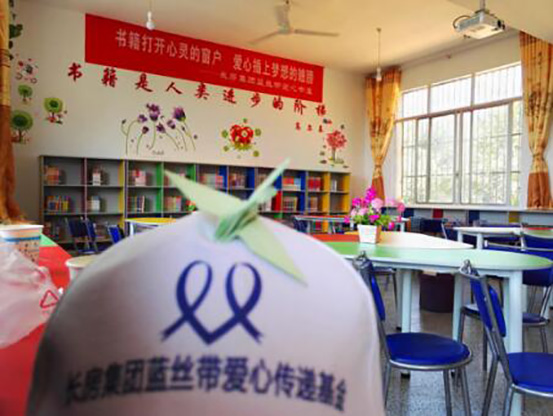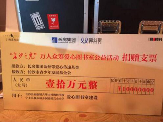 2016年初,晨報(bào)周刊攜手長(zhǎng)房梅溪香山、長(zhǎng)房集團(tuán)藍(lán)絲帶愛心傳遞基金共同發(fā)起“萬人眾籌圖書館”愛心公益活動(dòng),為湖南貧困山區(qū)學(xué)校捐建圖書室。以點(diǎn)亮希望之光、傳遞溫暖力量為主題的“長(zhǎng)沙之光”微信文稿每被轉(zhuǎn)發(fā)一次,即為籌建山區(qū)學(xué)校愛心圖書室捐贈(zèng)5元。活動(dòng)開展以來,贏得了許多社會(huì)愛心人士的熱烈反響和廣泛共鳴,共有1萬余人次參與活動(dòng),最終,通過長(zhǎng)房集團(tuán)藍(lán)絲帶愛心傳遞基金捐款10萬元,用于長(zhǎng)沙縣福臨鎮(zhèn)古華山村梅林小學(xué)和寧鄉(xiāng)縣灰湯鎮(zhèn)洞庭橋完全小學(xué)兩所貧困學(xué)校愛心書屋的建設(shè),長(zhǎng)沙市基少年發(fā)展基金會(huì)理事長(zhǎng)羊舒麟代表兩所學(xué)校接收捐贈(zèng)。