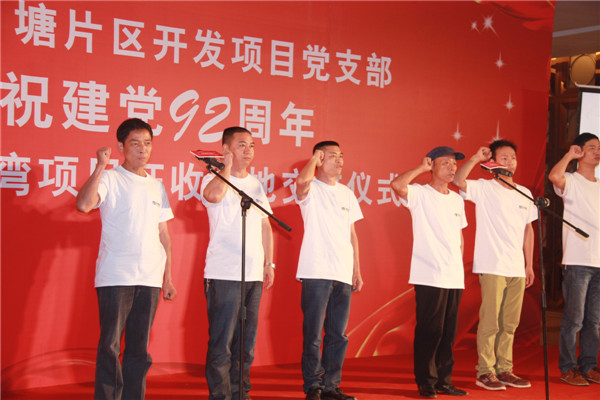 6月29日, “讓黨旗在工地上飄揚(yáng) 讓黨徽在崗位上發(fā)光 ”長(zhǎng)房•月塘片區(qū)開發(fā)項(xiàng)目黨支部慶祝建黨92周年暨半島藍(lán)灣項(xiàng)目征收騰地交接儀式在國(guó)廣公司售樓部隆重舉行。雨花區(qū)委書記周杏武,區(qū)委副書記汪娟等相關(guān)領(lǐng)導(dǎo), 集團(tuán)董事長(zhǎng)全臻,集團(tuán)其他黨委成員出席活動(dòng)。雨花區(qū)圭塘街道黨政班子成員、國(guó)廣公司黨支部全體黨員、長(zhǎng)房•月塘片區(qū)開發(fā)項(xiàng)目黨支部全體黨員參加活動(dòng)。