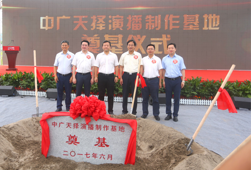 在熱烈的掌聲中,出席儀式的領(lǐng)導(dǎo)共同揮鍬培土為中廣天擇演播制作基地奠基。