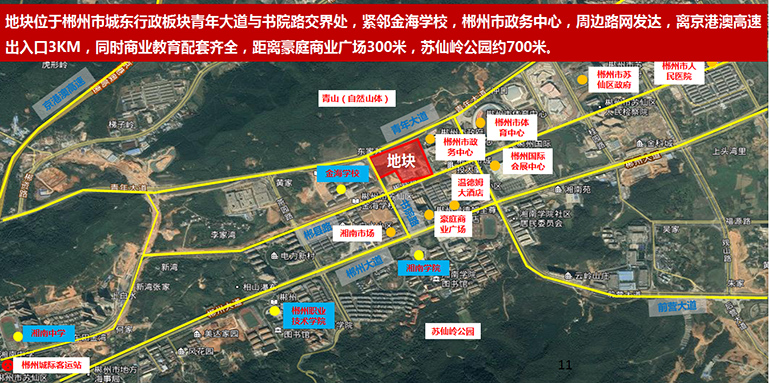該地塊位于蘇仙區(qū)青年大道與學院路交匯處東南角,為近期郴州市土地出讓市場推出的蘇仙區(qū)優(yōu)質地塊。項目周邊配套完善,有金海學校、湘南學院、郴州職業(yè)技術學院、郴州市政務中心、市體育中心、國際會展中心、蘇仙區(qū)政府等;同時片區(qū)品牌房企深耕,形成了較好的區(qū)域宜居認同感,有碧桂園江山一品、美的鉑悅府、金科城等。