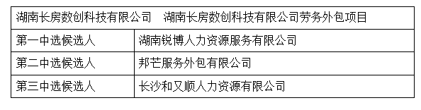 根據(jù)長(zhǎng)沙房產(chǎn)《集團(tuán)) 有限公司(以下簡(jiǎn)稱“長(zhǎng)房集團(tuán)”) 相關(guān)管理制度及集團(tuán)官網(wǎng)公開比選公告的規(guī)定,湖南長(zhǎng)房數(shù)創(chuàng)科技有限公司勞務(wù)外包項(xiàng)目集團(tuán)官網(wǎng)公開比選工作已經(jīng)結(jié)束。本項(xiàng)目評(píng)選辦法采用綜合評(píng)分法,根據(jù)評(píng)分分?jǐn)?shù)從高到低進(jìn)行排序,現(xiàn)將集團(tuán)官網(wǎng)公開比選中選候選人(排序) 公示如下: